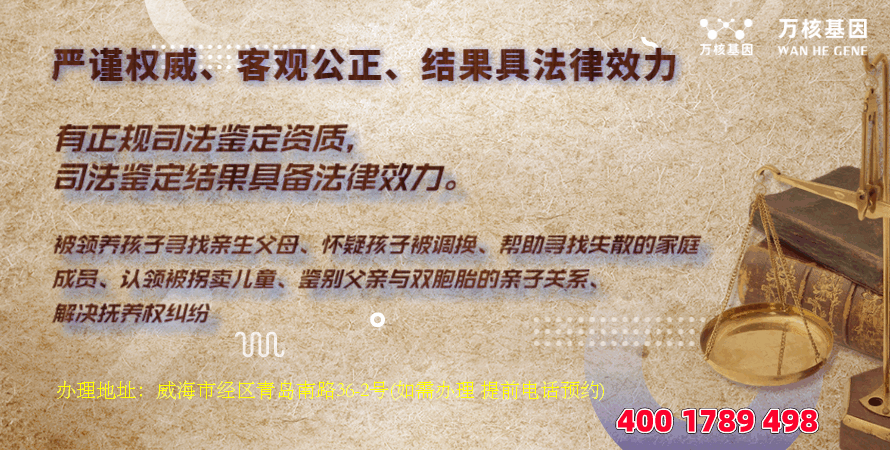 威海个人亲子鉴定办理地址:威海市经区青岛南路36-2号(如需办理,需提前预约)预约电话:4001789498,服务地址包括:环翠区、文登区、荣成市、乳山市等威海周边地区,威海亲子鉴定受理咨询处的服务范围涵盖了广义的亲子鉴定、DNA验证、亲子鉴定证明等等。
